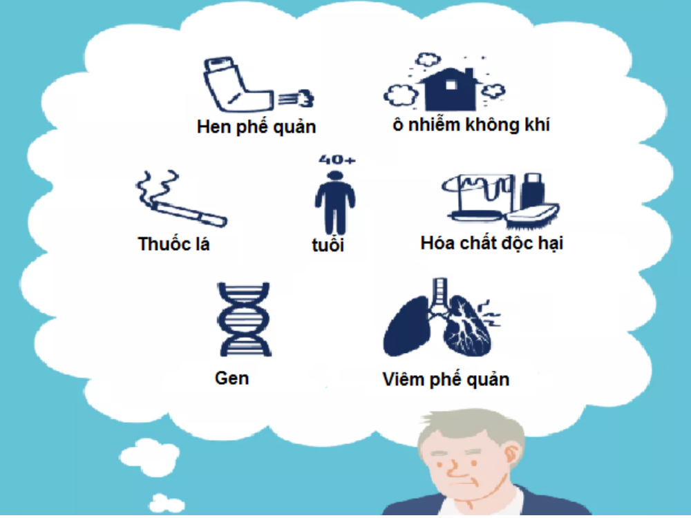 - Tiền sử: Hút thuốc lá, thuốc lào (bao gồm cả hút thuốc chủ động và thụ động). Ô nhiễm môi trường trong và ngoài nhà: khói bếp, khói chất đốt, bụi nghề nghiệp (bụi hữu cơ, vô cơ), hơi, khí độc. Nhiễm khuẩn hô hấp tái diễn, di chứng lao phổi,… Tăng tính phản ứng đường thở (hen phế quản hoặc viêm phế quản co thắt).