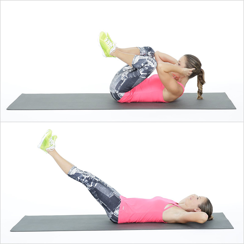 Bạn có thể tăng cường độ bằng cách duỗi thẳng một chân tạo thành một góc 45 độ so với mặt sàn hoặc nâng cả hai chân và gập đầu gối để cẳng chân song song với sàn.